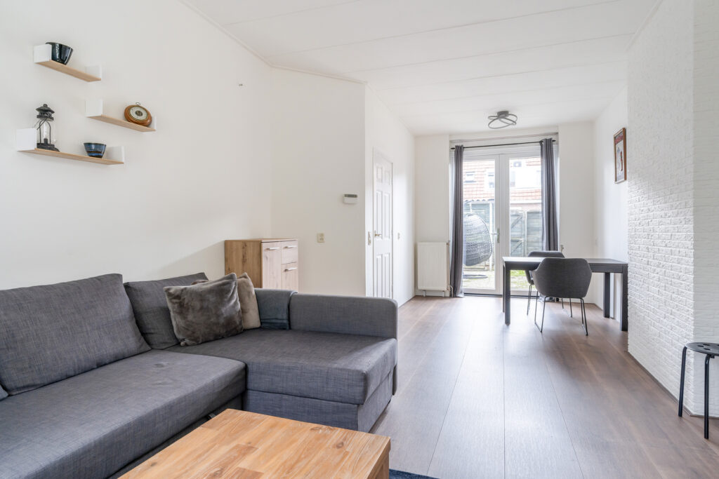 Je komt binnen via de beschutte voortuin in de lange hal met meterkast en trapopgang. Vanuit hier stap je de lichte doorzonwoonkamer binnen, voorzien van een sfeervolle erker, strakke muren en openslaande deuren naar de tuin. Door de indeling en lichtinval voelt de woonkamer direct warm en uitnodigend aan, een ideale plek om te ontspannen of gezellig te tafelen.