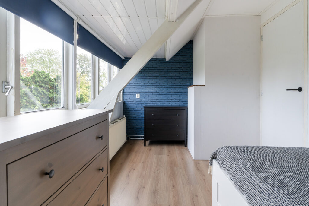 De lichte overloop geeft toegang tot twee slaapkamers. De slaapkamer aan de achterzijde is bijzonder ruim doordat hier voorheen twee kamers waren, ideaal als royale master bedroom, met gemak weer te splitsen voor wie extra kamers nodig heeft. De badkamer op deze verdieping is modern afgewerkt en voorzien van een inloopdouche, wastafelmeubel en tweede toilet. Via een vlizotrap is de bergvliering te bereiken (nokhoogte ca. 1.72 m), perfect als extra opslagruimte.