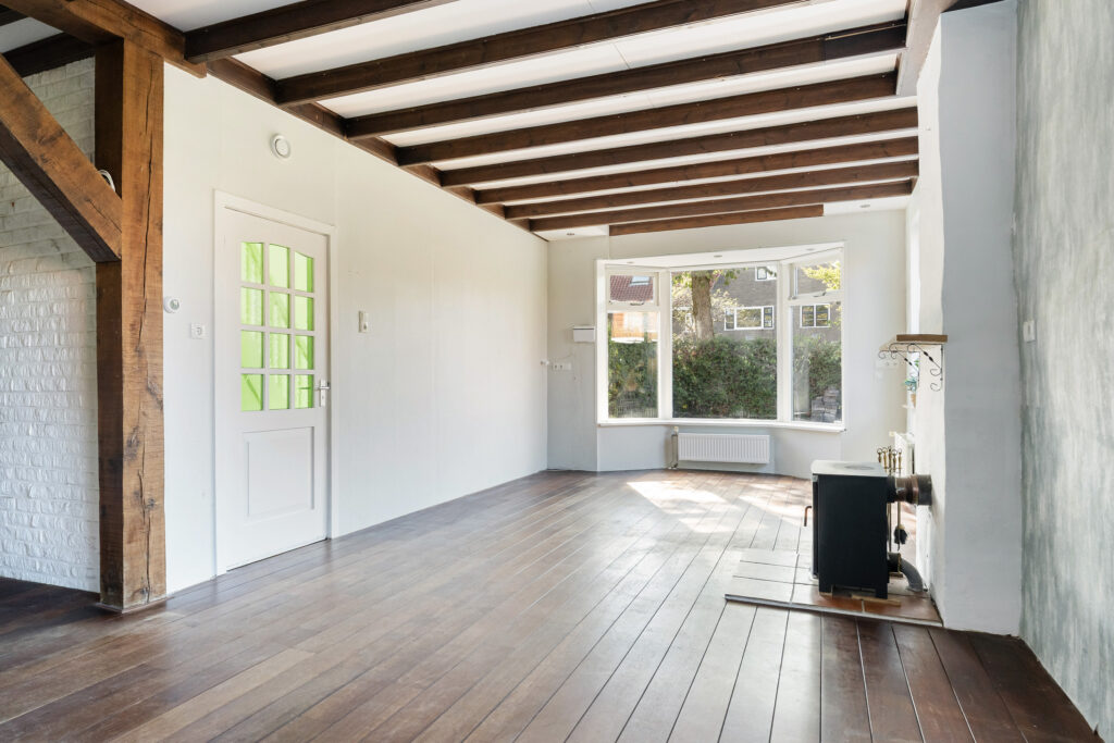 Via de voortuin stap je binnen in de fraaie entree met originele glas-in-looddetails. De ruime hal geeft toegang tot de meterkast, trapopgang en de woonkamer met open keuken. De woonkamer van bijna 40 m² ademt sfeer dankzij het authentieke balkenplafond, de sfeervolle houtkachel en de erker aan de voorzijde die zorgt voor extra licht en karakter.