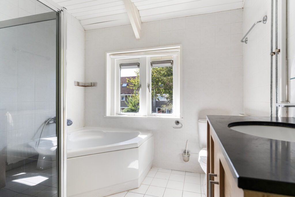 De overloop leidt naar drie slaapkamers en de badkamer. Aan de achterzijde bevinden zich twee kamers, waarvan één van ruim 15 m² en de ander toegang biedt tot het platte dak. Aan de voorzijde ligt nog een fijne slaapkamer van ca. 13 m² met prachtig uitzicht over het straatbeeld en de wijk. De badkamer is compleet uitgerust met ligbad, douche, wastafel met meubel en een tweede toilet.