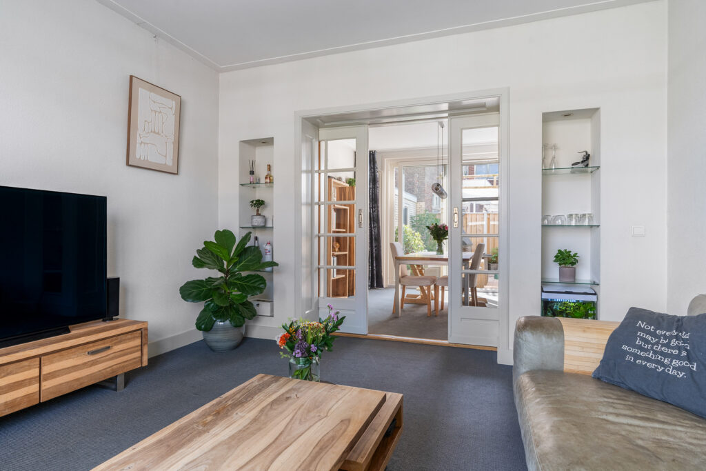 Bij binnenkomst kom je in de ruime hal, die toegang biedt tot het toilet, de trap naar boven en de doorgangen naar zowel de keuken als het woon- en eetgedeelte. De lichte woonkamer en eetkamer zijn met stijlvolle en-suite deuren van elkaar gescheiden en vormen samen een sfeervolle leefruimte met veel lichtinval dankzij de grote ramen. De ruimte voelt direct warm en uitnodigend aan, een plek waar je je meteen thuis voelt.