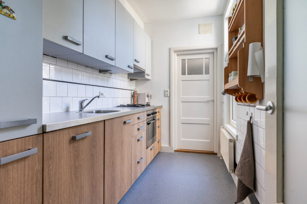 De keuken is netjes onderhouden, gewrapt, en voorzien van een nieuwe afzuigkap en nieuwe vaatwasser, evenals een 4-pits gasfornuis, oven en koelkast. Achter de keuken ligt een praktische bijkeuken, ideaal voor extra bergruimte, wasapparatuur of het stallen van fietsen.