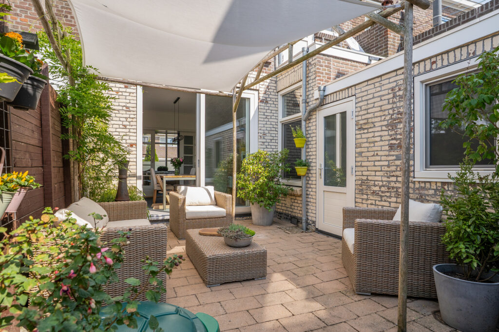 De zonnige achtertuin op het zuidwesten is met circa 21 m² een heerlijke plek om te genieten van de zon. De tuin is verzorgd aangelegd, voorzien van groen en biedt voldoende privacy. Dankzij de achterom is de tuin ook gemakkelijk bereikbaar met bijvoorbeeld fietsen of tuinspullen.