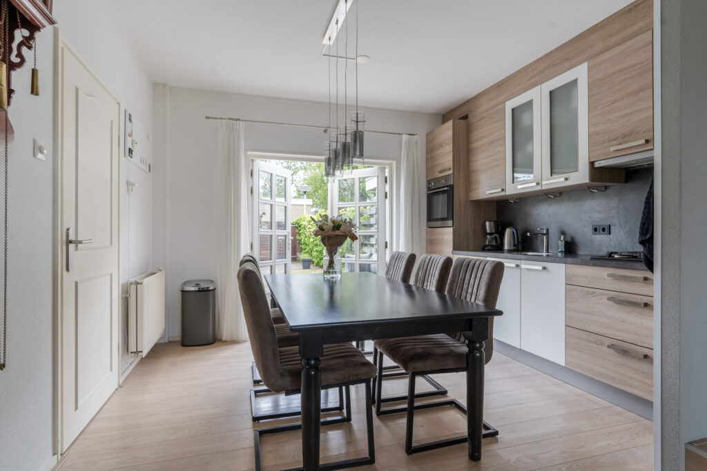 Aangrenzend bevindt zich de bijkeuken aan de achterzijde van de woning. Hier is plaats voor een vriezer en een was-droogcombinatie en er is volop bergruimte in de aanwezige kasten. Vanuit de keuken bieden openslaande deuren direct toegang tot de achtertuin.
