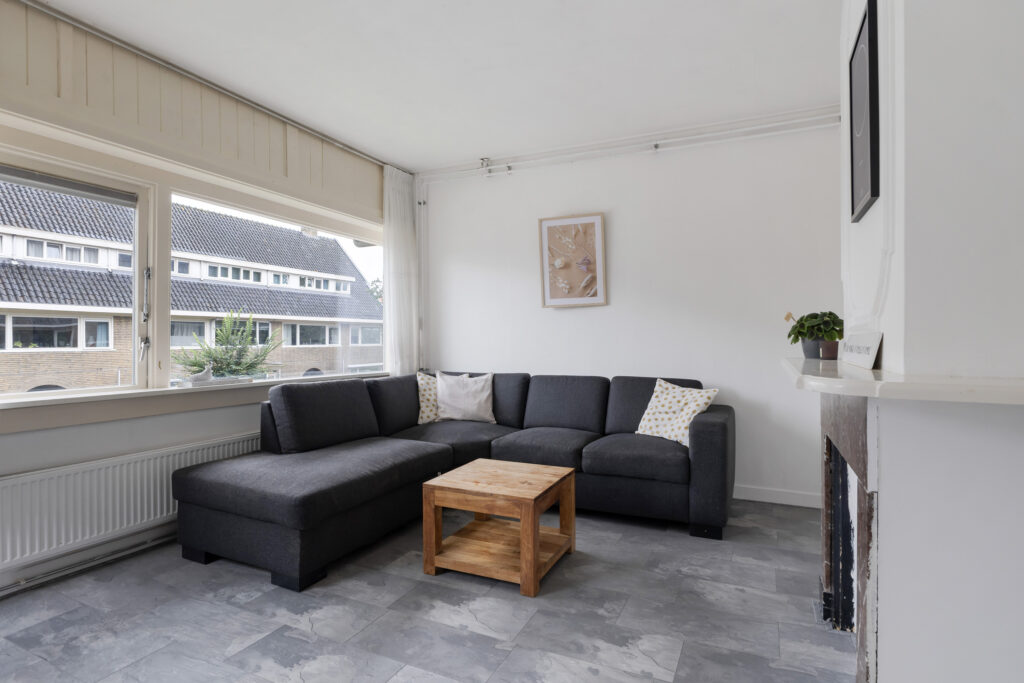 Aan de voorzijde van de woning vind je de sfeervolle woonkamer. Grote ramen zorgen voor veel lichtinval en bieden vrij uitzicht over de straat en het omliggende groen. De kamer beschikt over een sierschouw en een praktische doorloopkast.