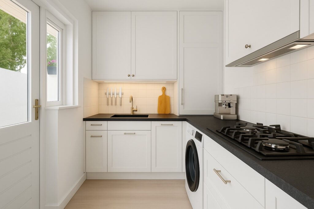 Via de overloop bereik je het toilet. Aan de achterzijde bevindt zich de keuken. Deze is eenvoudig ingericht en biedt ruimte voor losse apparatuur zoals een vaatwasser, wasmachine en een koelkast. Vanuit de keuken heb je direct toegang tot het balkon op het oosten, een fijne plek om 's ochtends van de zon te genieten of 's avonds ontspannen te dineren.