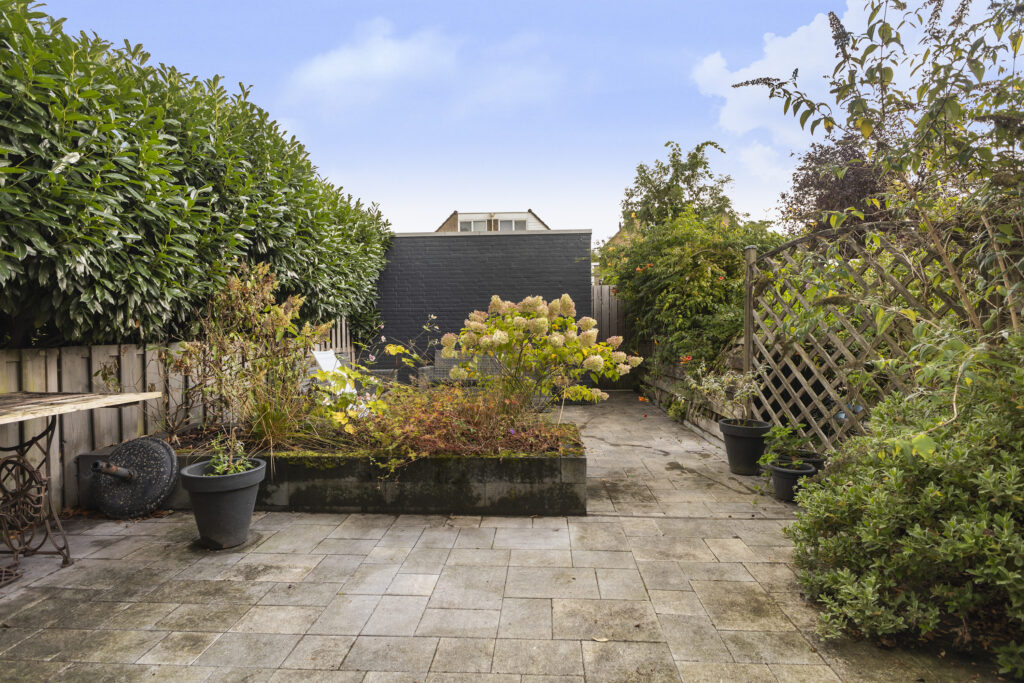 De achtertuin, gesitueerd op het noorden, loopt iets schuin af en beschikt over twee terrassen, zodat je altijd wel een plekje in de zon kunt vinden. Achterin de tuin staat een vrijstaande stenen berging en er is een praktische achterom.