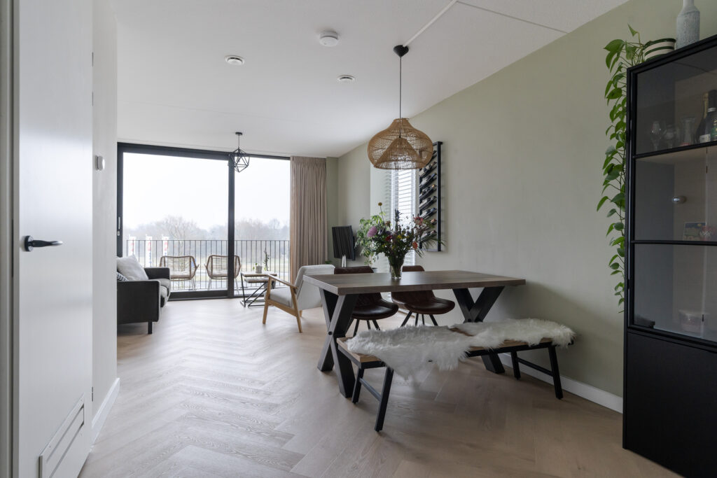 De entree biedt toegang tot de lichte en sfeervolle woonkamer, die dankzij de hoekligging profiteert van extra daglicht via een groot zijraam. Via de aluminium schuifpui bereik je het balkon van circa 5 m², gunstig gesitueerd op het zuidoosten en met vrij uitzicht over de omgeving.