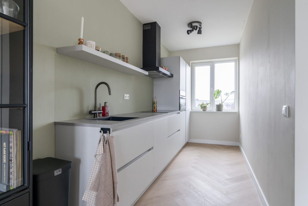 Tijdens de bouw is bewust gekozen voor extra leefruimte in plaats van een tweede slaapkamer. Hierdoor vormt de open woonkeuken het centrale punt van het appartement. Deze is uitgevoerd met hoogwaardige inbouwapparatuur, waaronder een inductiekookplaat met afzuiging, een kokend water kraan, een combi oven/magnetron, vaatwasser en koelkast, en biedt volop ruimte voor comfortabel koken en wonen.