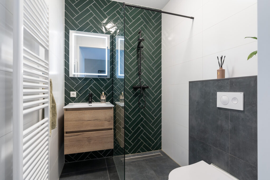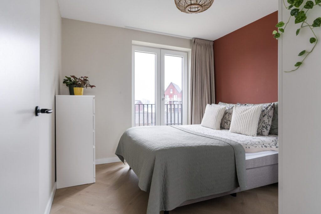 Aan de achterzijde bevindt zich de slaapkamer. Deze royale kamer van circa 11 m² beschikt over een Frans balkon en biedt een schuin vrij uitzicht over water en groen. De moderne badkamer is volledig uitgerust met een inloopdouche, wastafelmeubel en toilet.