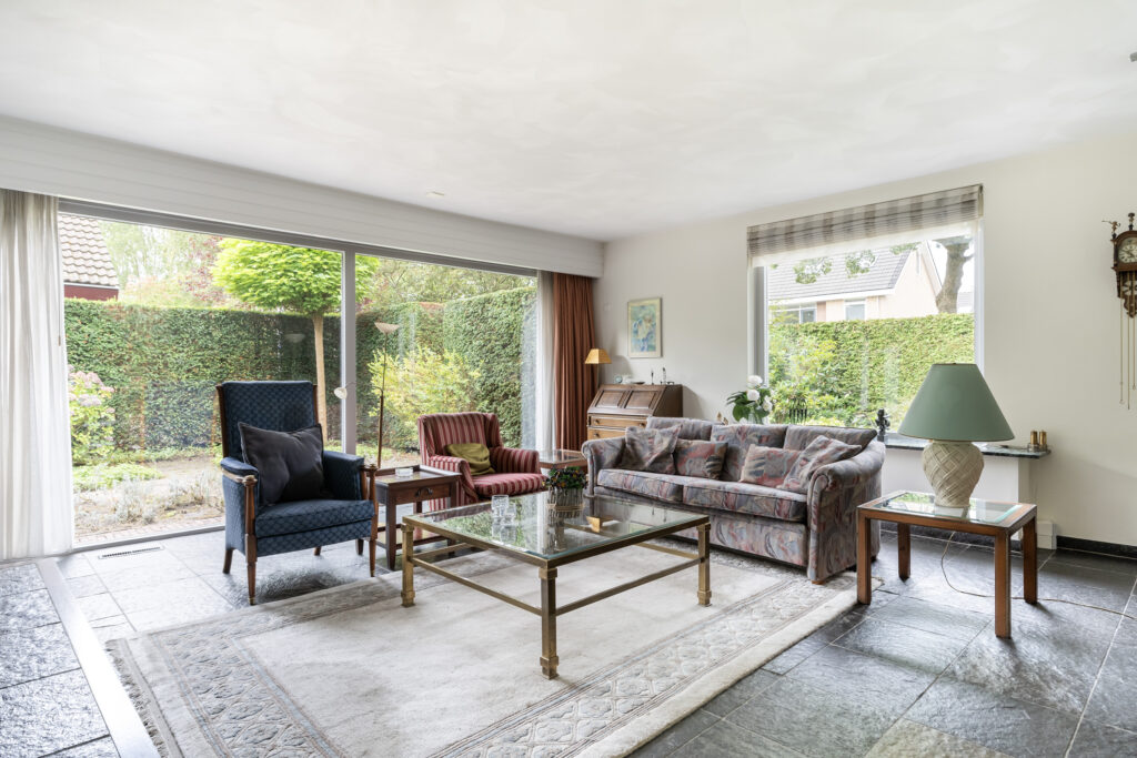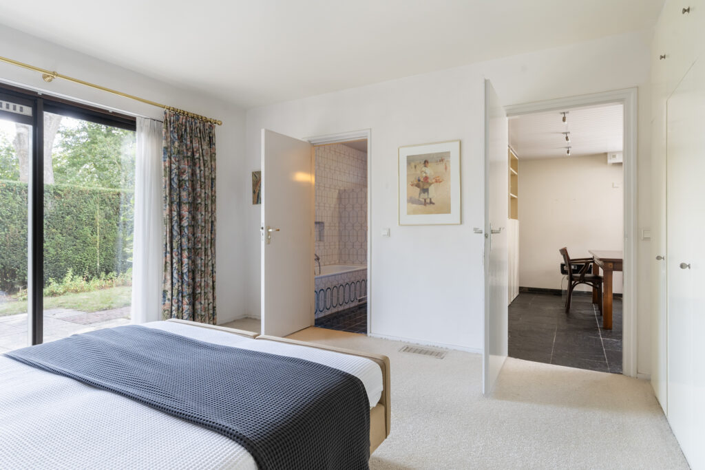 De achtertuin is een van de pluspunten van deze woning: zonnig, groen en beschut, met veel privacy. Zowel de eetkamer als de royale slaapkamer aan de achterzijde bieden via schuifpuien directe toegang tot deze fijne buitenruimte. De slaapkamer baadt ’s ochtends in zonlicht en beschikt over een eigen badkamer met bad, douche, wastafel en toilet, ideaal voor wie gelijkvloers wil wonen met alle comfort binnen handbereik.