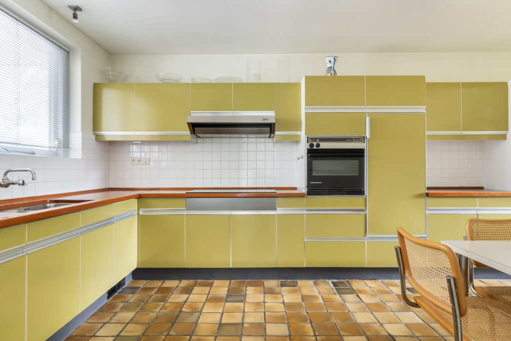 De eetkamer sluit aan op de ruime keuken, die praktisch is ingedeeld en voorzien van moderne apparatuur zoals een kookplaat, afzuigkap, oven, koelkast en vaatwasser. Vanuit de keuken bereik je de bijkeuken, die toegang biedt tot zowel de inpandige garage als de achtertuin. De garage is extra ruim en ook via deze ruimte is de tuin bereikbaar.
