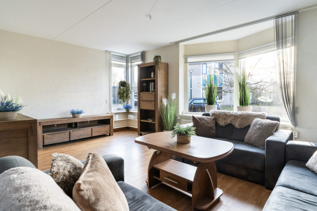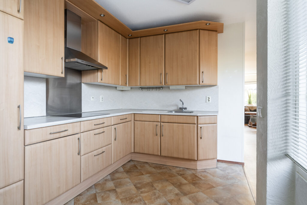 De woonkamer is aan de zuidzijde gesitueerd en profiteert daardoor van veel natuurlijk licht. De open indeling zorgt voor een prettige verbinding tussen wonen, koken en eten. Er is een praktische trapkast en aan de achterzijde bevindt zich de eethoek met een deur naar de achtertuin. De keuken is voorzien van inbouwapparatuur en sluit aan op de bijkeuken, waar zich de witgoedaansluitingen bevinden. Vanuit de bijkeuken heb je directe toegang tot zowel de garage als de achtertuin.