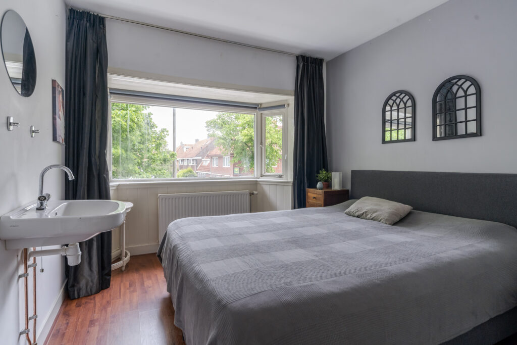 De overloop biedt toegang tot het platte dak, drie slaapkamers (twee ruime met inbouwkasten en één kleinere kamer), een vaste kast en de trap naar de tweede verdieping. De kamer aan de voorzijde is extra licht door de doorgetrokken erker en biedt een aangenaam uitzicht over de straat.