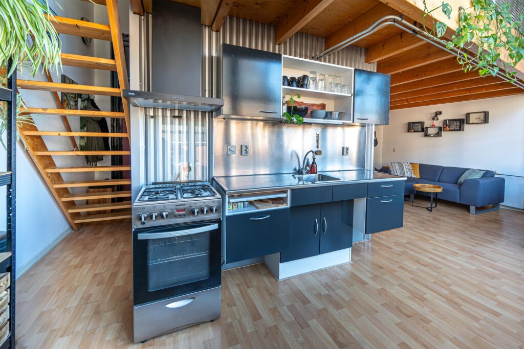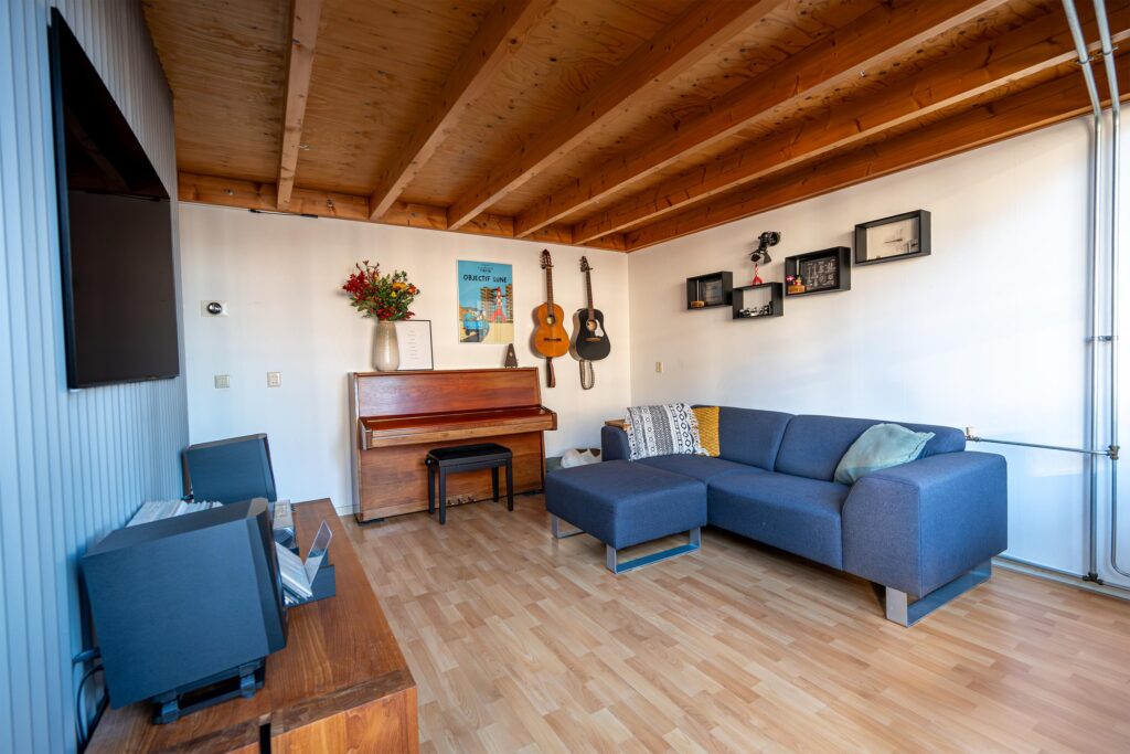 Via de centrale hal neem je de trap naar de eerste verdieping. Via de entree kom je in de gang die toegang geeft tot de woonkamer. In deze gang bevinden zich een berging met een de Remeha Avanta Ace HR-combiketel (2022) en witgoedopstelling, evenals een separate toiletruimte met fonteintje. De woonkamer is sfeervol en heeft een open verbinding met de keuken, die is voorzien van losse apparatuur. Dankzij de hoge, grote raampartijen geniet je hier zelfs op donkere dagen van veel natuurlijke lichtinval. De keuken is ruim opgezet en functioneel ingericht, waardoor de beschikbare ruimte optimaal is benut.