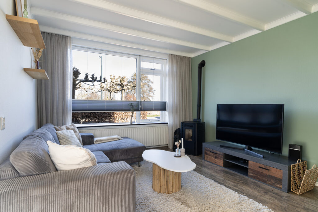 Via de lichte entree kom je binnen in de hal met toegang tot het toilet, de trap naar de eerste verdieping en de woonkamer. De woonkamer is ruim en prettig licht door de grote raampartijen en de gunstige ligging. Hier vind je ook een praktische inbouwkast en een sfeervolle pelletkachel die zorgt voor extra warmte en gezelligheid.