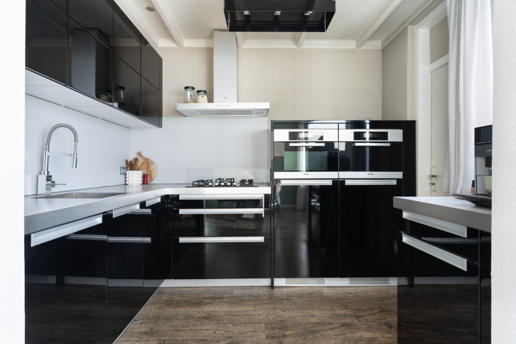 De open keuken voorzien van diverse inbouwapparatuur en sluit naadloos aan op de woonkamer. Vanuit de keuken kom je in de bijkeuken waar zich de witgoedaansluitingen bevinden. De bijkeuken biedt extra bergruimte en geeft toegang tot zowel de garage als de achtertuin.