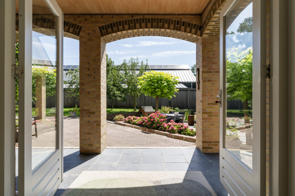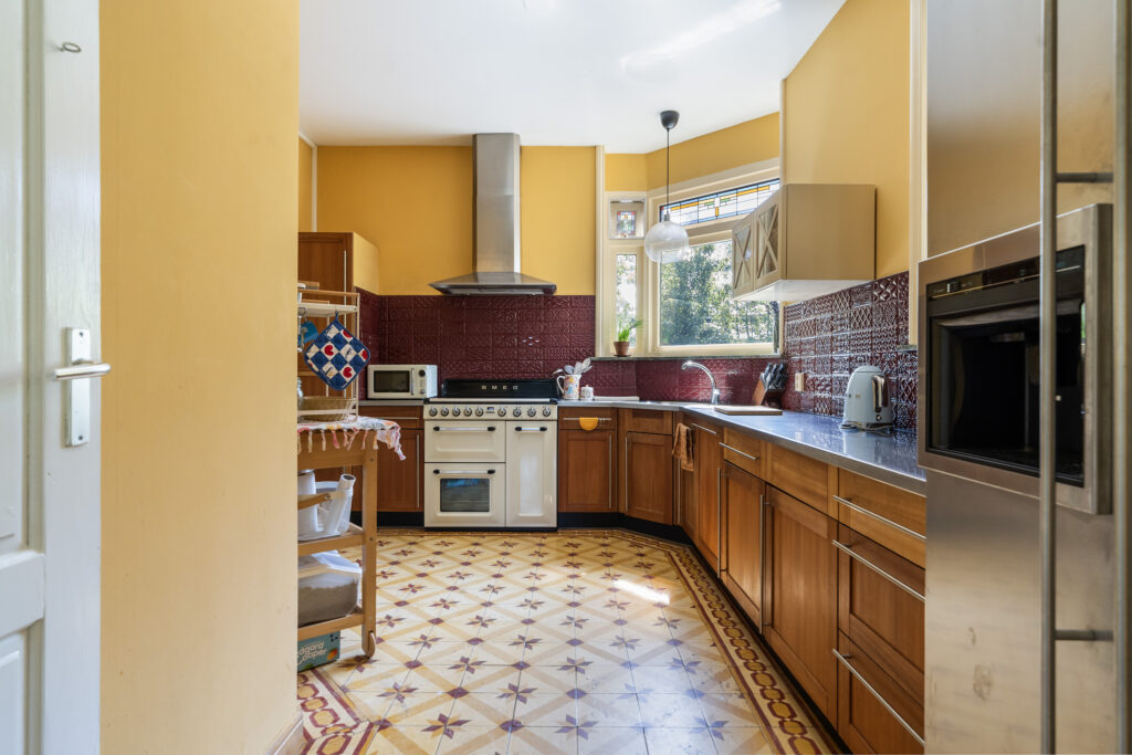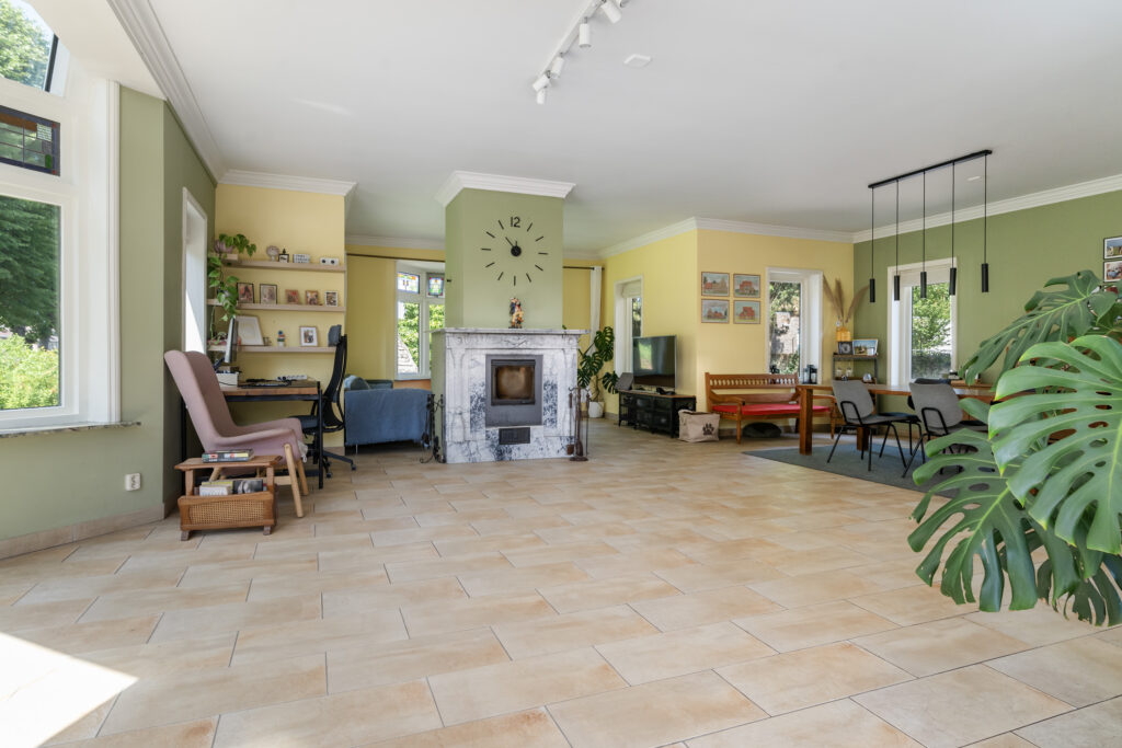 De woonkamer is een sfeervolle ruimte met een Italiaanse tegelvloer, twee erkers, openslaande deuren naar de veranda, een houthaard, een schouw én een ambachtelijke tegelkachel van Fetze Tigchelaar (Fin Oven 18). Dankzij een extra staalconstructie is een grote overspanning mogelijk gemaakt, waardoor de ruimte royaal en open aanvoelt.