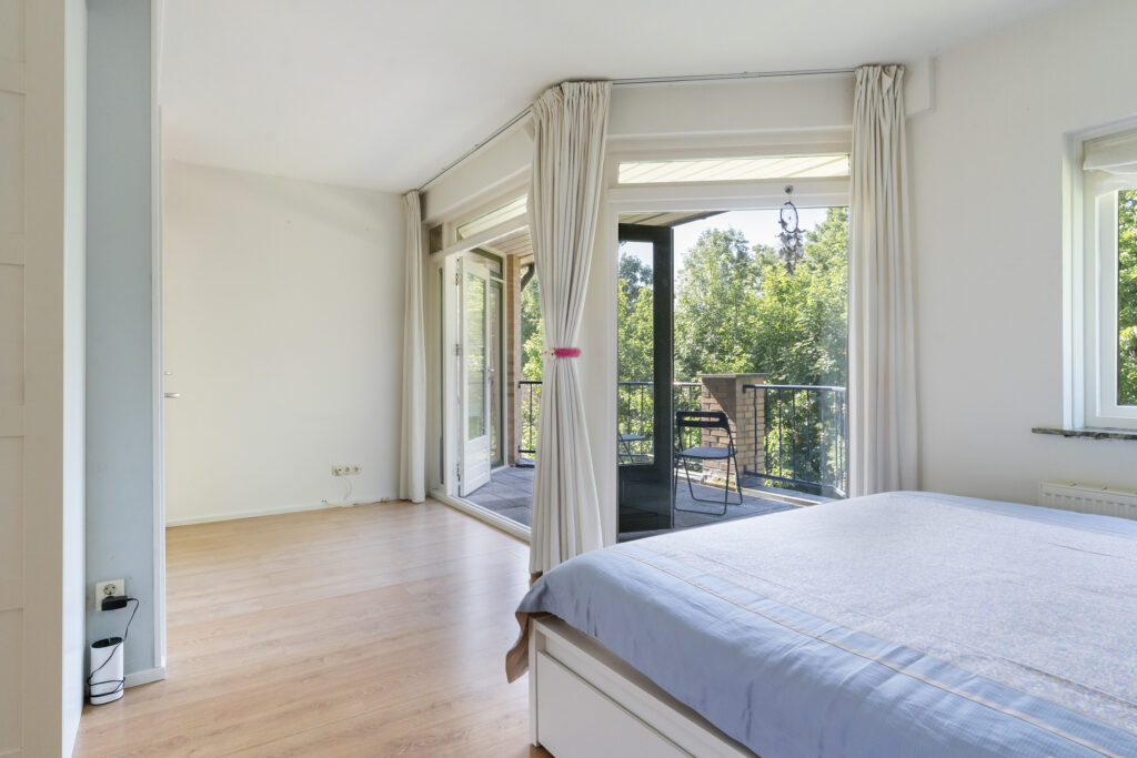 De overloop met vide geeft toegang tot meerdere ruimtes. Aan de achterzijde bevindt zich een slaap-/werkkamer met erker, die tevens toegang biedt tot een grote zolderruimte boven de garage, waar zich ook de cv-installatie bevindt. Aan de voorzijde ligt een ruime U-vormige slaapkamer met fraaie dakkapel, vaste kast, openslaande deuren naar een loggia en een eigen badkamer met ligbad en wastafel.