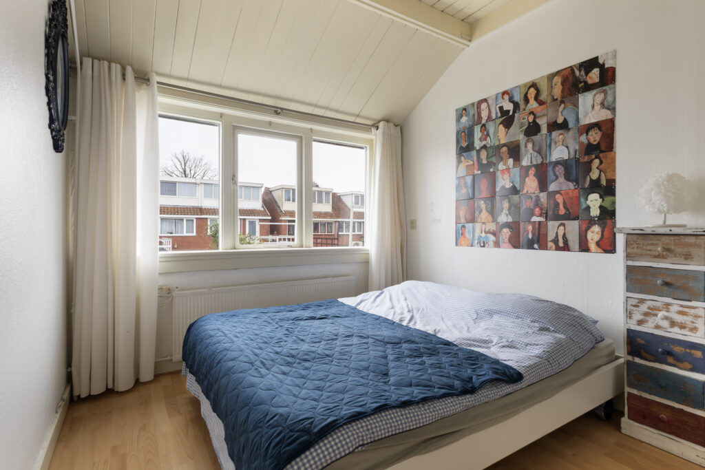 Via een vaste trap kom je op de tweede verdieping. Op de overloop is extra opslagruimte gecreëerd. Dankzij de grote dakkapel aan de achterzijde is hier verrassend veel extra ruimte ontstaan. Aan de achterzijde bevindt zich de derde slaapkamer: een fijne, ruime kamer met een prachtig uitzicht over de skyline van Leeuwarden.