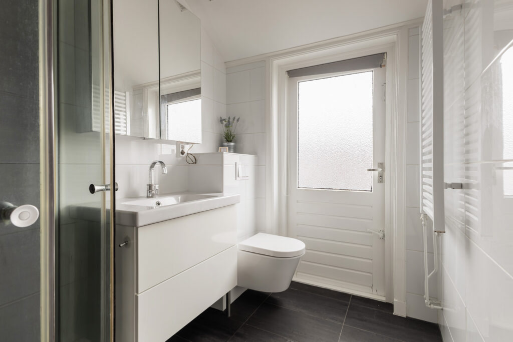 De ruime badkamer bevindt zich eveneens op deze verdieping en is uitgerust met een met douche, wastafelmeubel en een tweede toilet, daarnaast is hier de doorgang naar het platte dak.