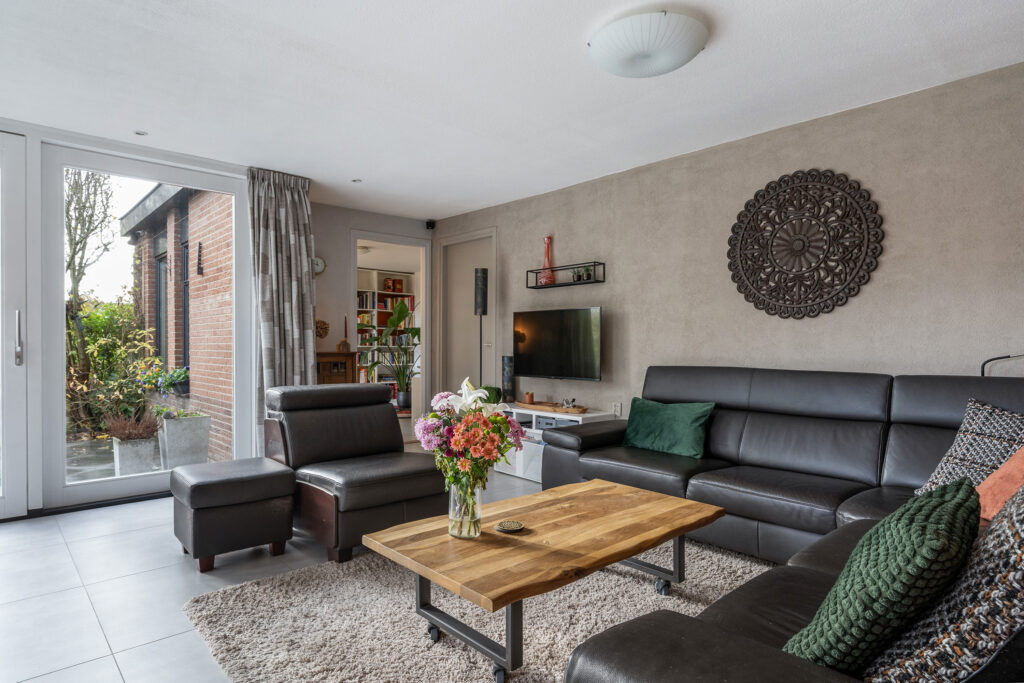 De sfeervolle woonkamer kijkt uit op het park met vijver en is gericht op het oosten, waardoor je ’s ochtends heerlijk licht hebt. Via de schuifpui loop je zo het zonnige terras op het zuiden op – ideaal om buiten te genieten, bijvoorbeeld met een kop koffie of een borrel in de zon.