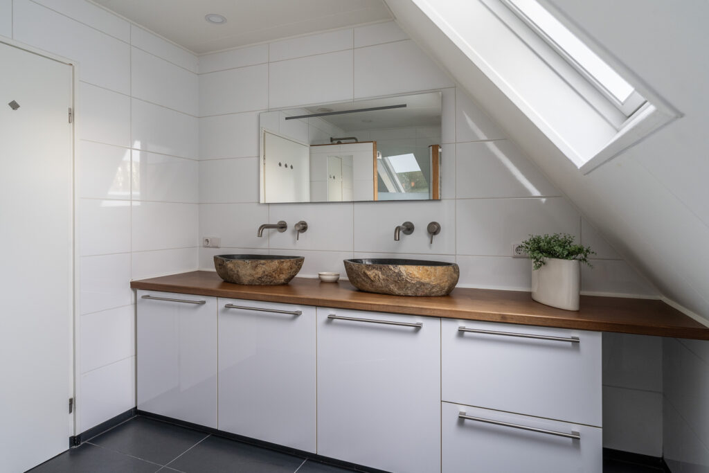 De badkamer is luxe uitgevoerd met een ligbad, aparte douche, dubbele wastafel met moderne mengkranen en een verlichte spiegel. Op de overloop is er bovendien een bergkast met ruimte voor de cv-installatie. Via de vlizotrap kom je op de ruime bergzolder waar je al je extra spullen kwijt kunt.