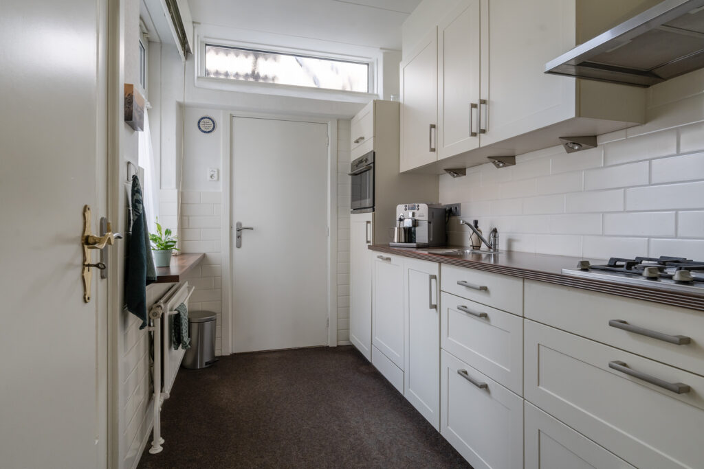 De keuken is verzorgd en uitgerust met een 4-pits gasfornuis, inbouwkoelkast, vaatwasser en combi-oven. Aansluitend vind je de ruime bijkeuken (ca. 16 m²) waar de witgoedopstelling én de CV-ketel (2024) zijn gesitueerd. Vanuit hier heb je toegang tot de tuin én de garage, die voorzien is van een praktische overheaddeur. Voor de garage bevindt zich een parkeerplek op eigen terrein, met de mogelijkheid om een elektrische laadpaal te plaatsen.
