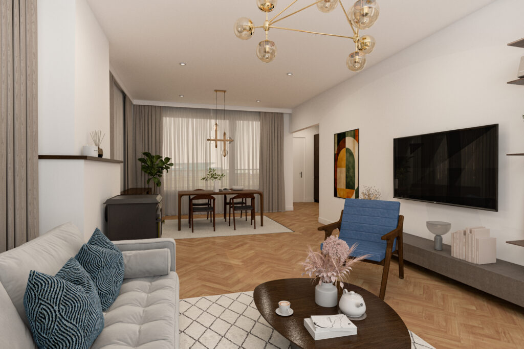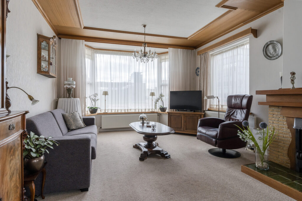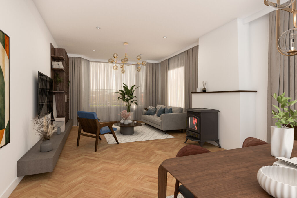 Via de keuken stap je de sfeervolle woonkamer binnen, die baadt in het daglicht dankzij de grote ramen met sierlijke afwerking. De plafondhoogte van 270 cm, afgewerkt met prachtige houten sierlijsten, geeft de ruimte karakter. Hier is volop plek voor een gezellige zithoek en een ruime eettafel. De sfeervolle keramieken gashaard vormt het warme middelpunt van de kamer en draagt bij aan de huiselijke ambiance.