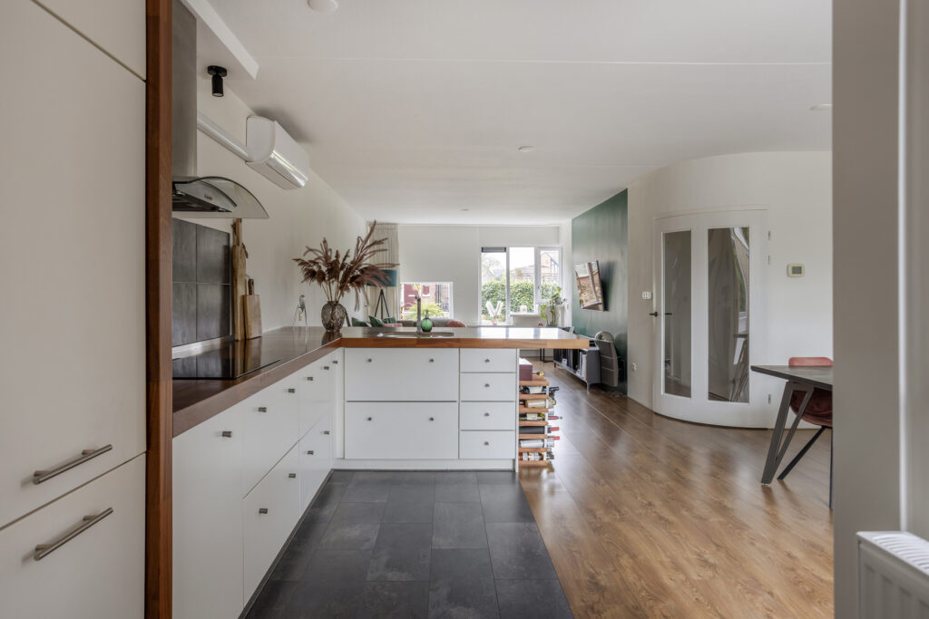 Via de lichte entree met vernieuwde meterkast (2023), toilet en doorgang naar werk/slaapkamer kom je in de ruime doorzonwoonkamer met schuifpui naar de tuin. De open woonkeuken is voorzien van een handgemaakte inrichting met moderne apparatuur. Aansluitend bevindt zich de praktische bijkeuken met wasmachineaansluiting en directe toegang tot de tuin.