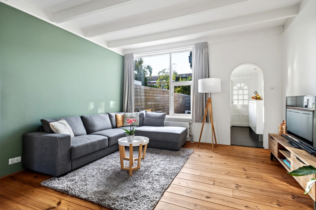 Bij binnenkomst in de entree tref je de meterkast, de trap naar boven en de deur naar de woonkamer. De woonkamer straalt warmte en karakter uit door de houten vloer, het balkenplafond en de prettige lichtinval via de grote raampartijen aan de achterzijde. Aan de voorzijde is er een fijne plek voor een eethoek of werkruimte met uitzicht op de rustige straat.