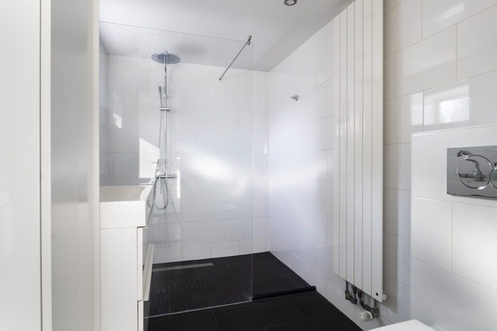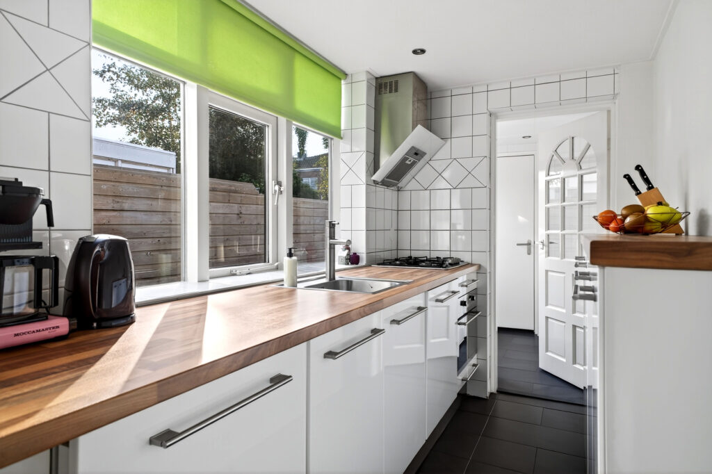 De halfopen keuken (2011) is praktisch ingericht en van alle gemakken voorzien. Aansluitend bevindt zich de bijkeuken met witgoedaansluiting en toegang tot de tuin. Hier vind je ook de badkamer, voorzien van een moderne inloopdouche, toilet en wastafelmeubel.
