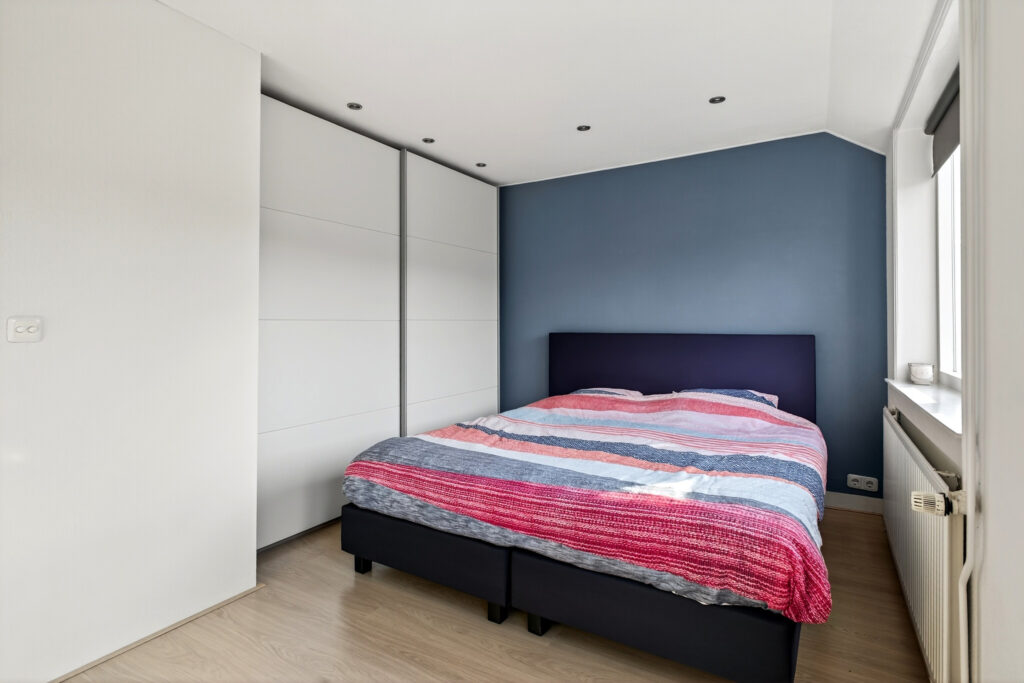 De overloop is licht en geeft toegang tot twee slaapkamers. De slaapkamer aan de achterzijde (ca. 13 m²) is vergroot door het samenvoegen van twee kamers en beschikt over een deur naar het platte dak. De slaapkamer aan de voorzijde (ca. 9 m²) heeft een handige ruime inbouwkast. Via een luik is de bergvliering te bereiken, ideaal voor extra opbergruimte.