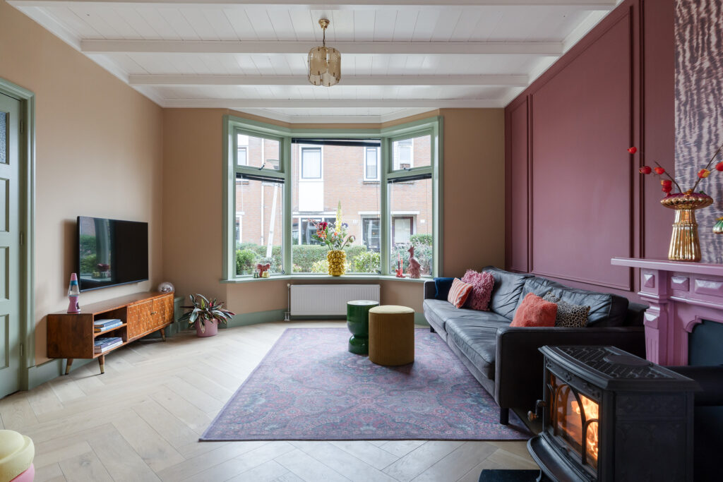 De entreehal ademt direct de sfeer van de jaren ’30, met originele details en een vaste trap naar de eerste verdieping. Vanuit de hal stap je de lichte woonkamer binnen, waar de erker zorgt voor een prettige lichtinval en veel karakter.