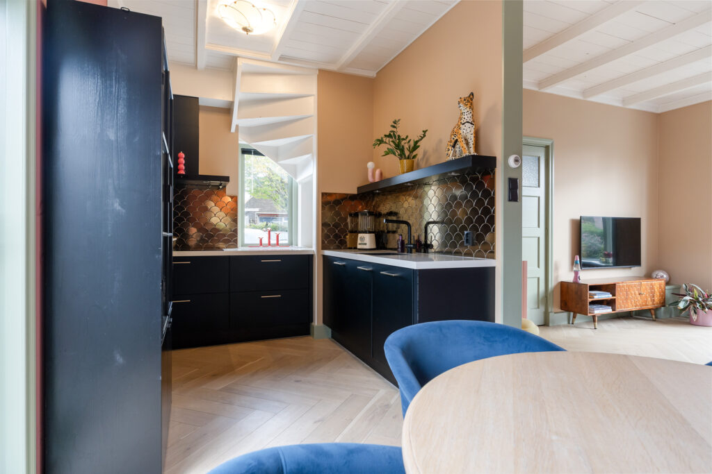 Aansluitend bevindt zich de ruime keuken, voorzien van diverse inbouwapparatuur. Achter de keuken ligt de bijkeuken met werkblad, oven en een aparte toiletruimte.