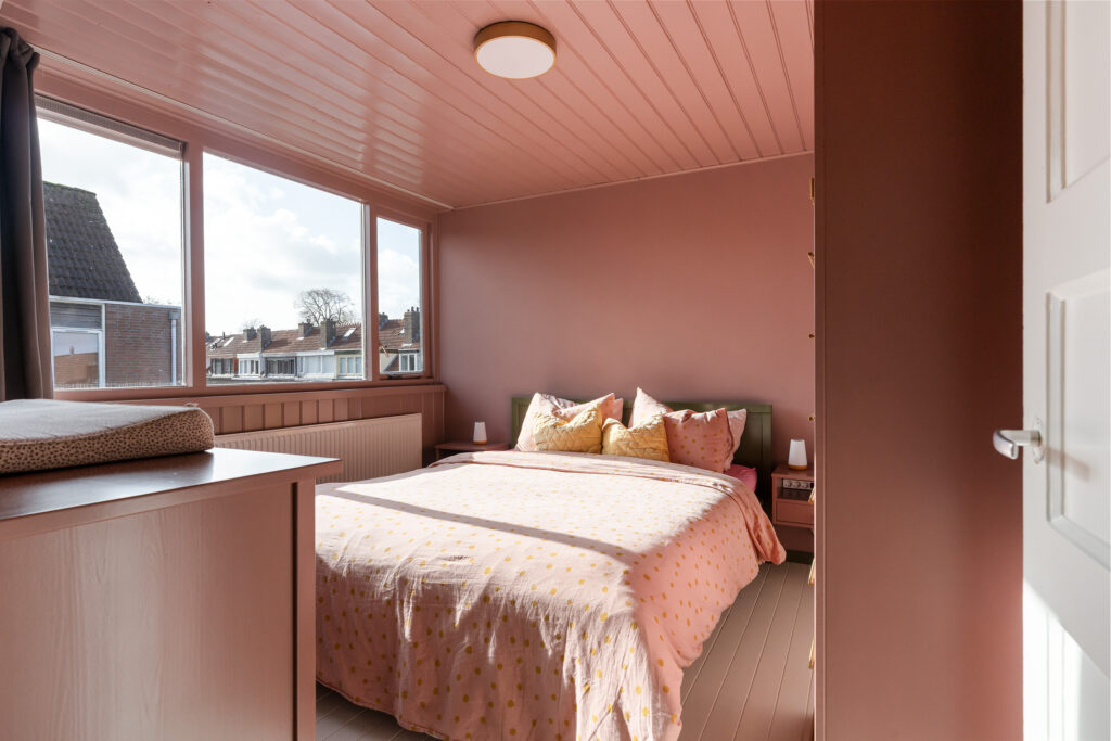 De hoofdslaapkamer is ruim opgezet en voorzien van veel daglicht. De badkamer is eenvoudig maar stijlvol ingericht met een douche, wastafelmeubel en witgoedopstelling.
