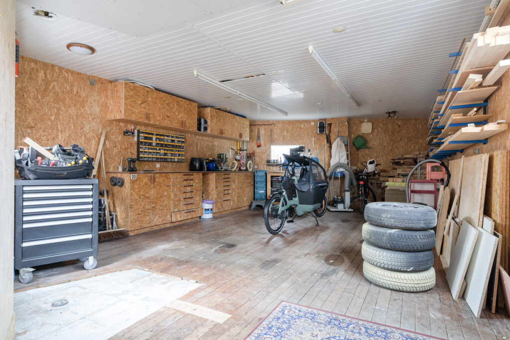 Deze garage is toegankelijk vanuit de bijkeuken én via de openslaande deuren aan de parkeerzijde. Met een oppervlakte van maar liefst 43 m² biedt deze ruimte talloze mogelijkheden. En het gemak? Je loopt er zo vanuit de bijkeuken naartoe.