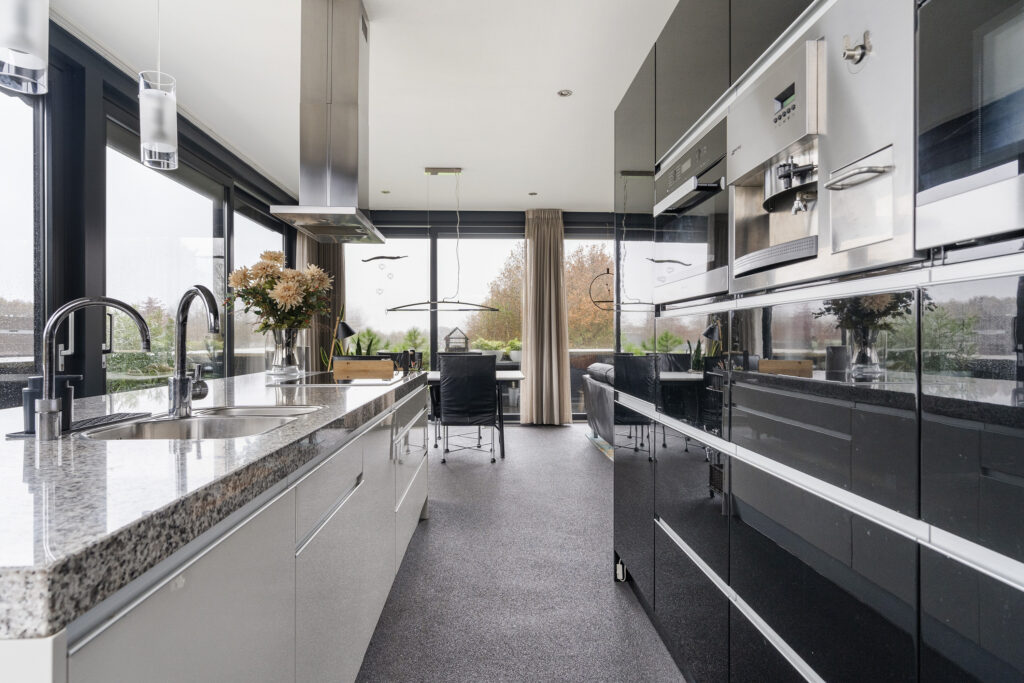 De open woonkeuken met modern kookeiland en luxe apparatenwand is een echte blikvanger. Hier kun je heerlijk koken, eten en samen genieten.