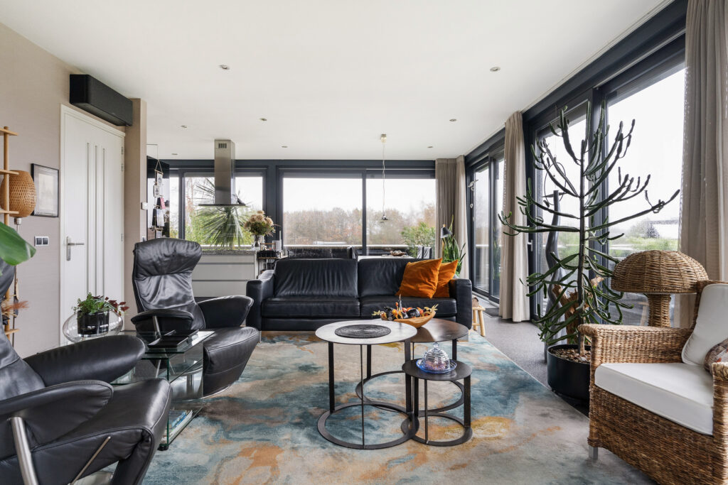 De royale living van ca. 50 m² is ingedeeld met een gezellige zithoek, tv-hoek en een ruime keukenopstelling. Wonen op de verdieping betekent hier genieten van prachtige zichtlijnen aan alle kanten en overvloedig daglicht. De grote ramen (schuifpuien) die geheel open geschoven kunnen worden geven toegang tot het dakterras. Stijlvolle spotverlichting en het royale dakterras rondom zorgen voor een unieke woonbeleving.